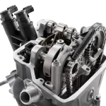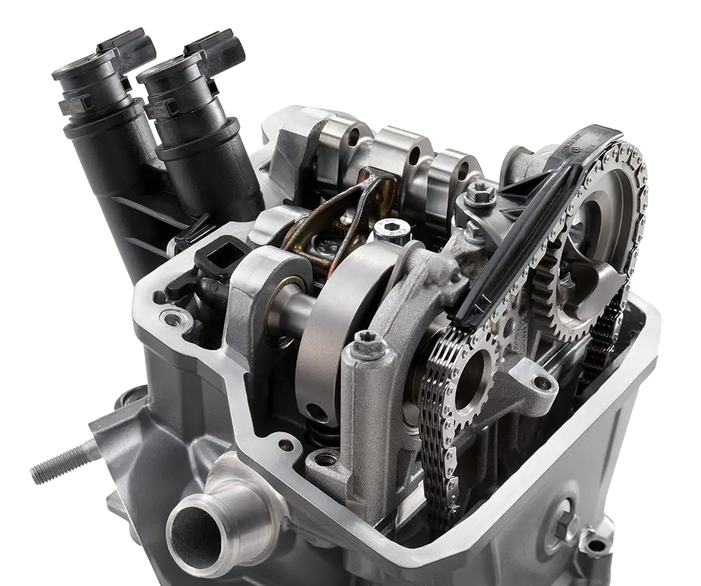 El diseño compacto de la culata con un solo árbol de levas en cabeza cuenta con dos válvulas de admisión de 42 mm y dos válvulas de escape de 34 mm, accionadas por un robusto sistema de balancines, que garantiza una distribución precisa a alto régimen. El encendido es mediante doble bujía, cada una de ellas con su propio control de sincronización de encendido para lograr una combustión óptima de la gasolina en la gran cámara de combustión.