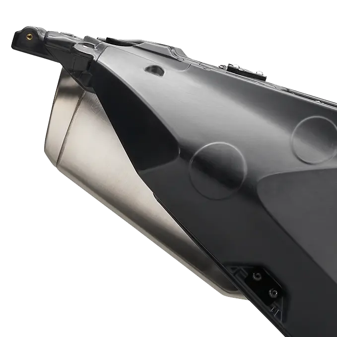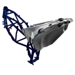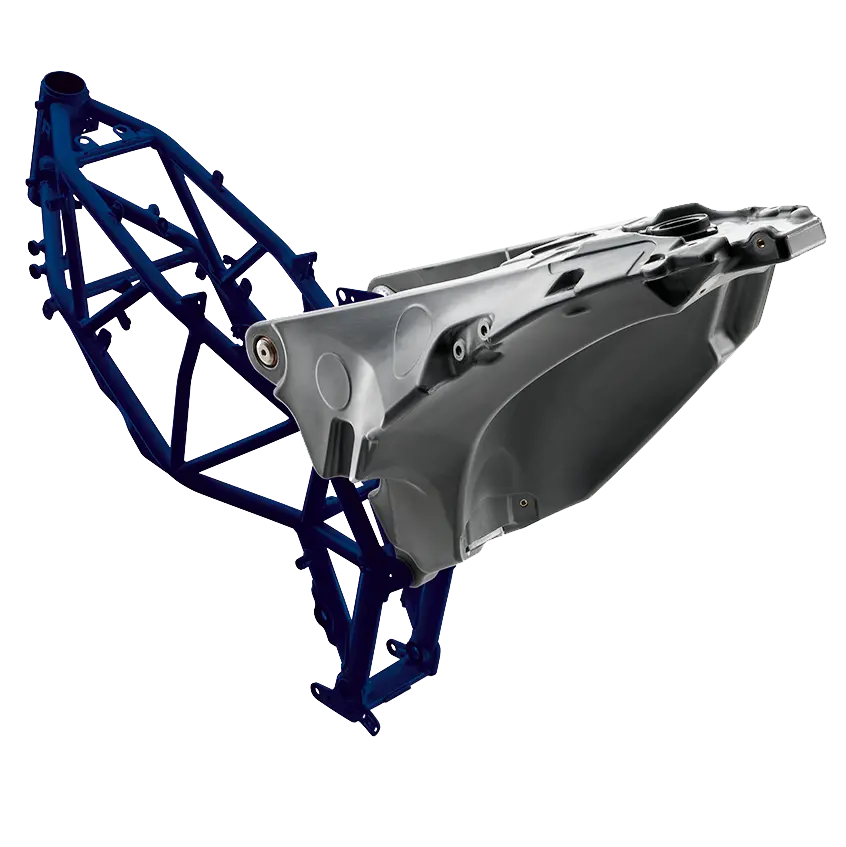 El subchasis trasero independiente con un depósito de combustible de 13 litros integrado presume de una posición única que permite obtener la mejor distribución de peso posible. Fabricado mediante un proceso de moldeo rotacional para termoplásticos, la estructura de una sola pieza pesa solamente 5,2 kg y está hecha de poliamida de alta resistencia.