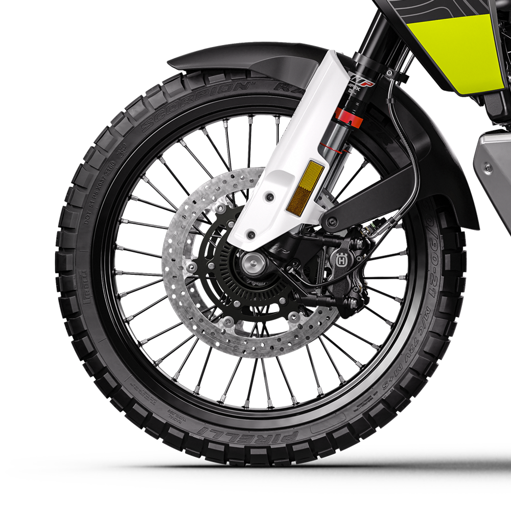 Para sobresalir en la carretera y en superficies sin asfaltar, el Norden 901 necesita frenos con potencia y control. Puede confiar en que el sistema controlado ABS de Bosch le permitirá realizar una parada rápida y precisa con confianza en una variedad de superficies y condiciones. El sistema de frenos J.Juan de Husqvarna aporta la tecnología derivada de MotoGP a la Norden 901. Las pinzas delanteras radiales de cuatro pistones actúan sobre dos discos de freno flotantes de Ø 320 mm para brindarle una sensación y respuesta excepcionales en la palanca. El freno trasero tiene un disco de Ø 260 mm y una pinza flotante de dos pistones. Los pistones de la pinza trasera tienen placas de aislamiento para mantener la estabilidad térmica para que el freno no se esfuerce al afrontar largos tramos cuesta abajo en el camino. El sistema ABS de Bosch se puede desactivar en la rueda trasera para conductores avanzados.