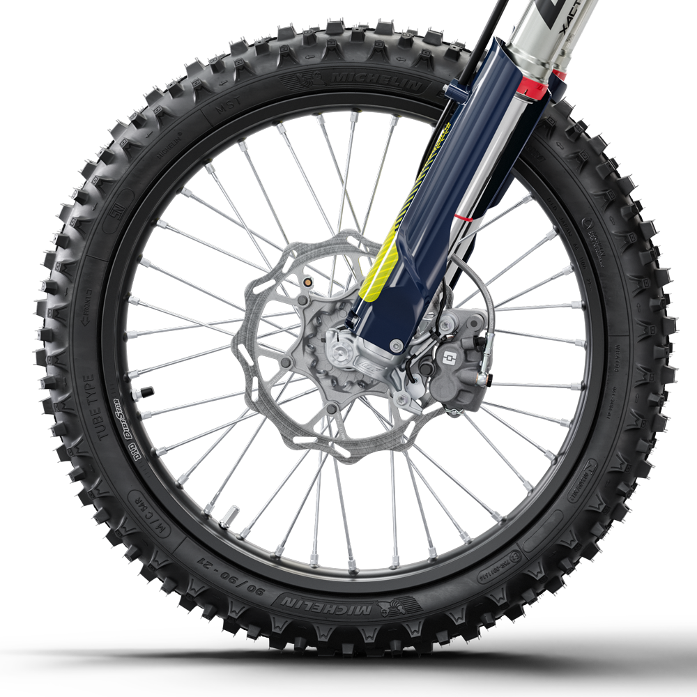 El máximo nivel de rendimiento está garantizado con los últimos sistemas de frenado BRAKTEC, diseñados específicamente para el pilotaje de enduro. Las nuevas pinzas, las nuevas pastillas, las nuevas manetas y los nuevos latiguillos de freno, junto con los discos de perfil ondulado GSK (el delantero de 260 mm y el trasero de 220 mm) dan como resultado un tacto sensible y progresivo que garantiza un control total en todas las condiciones.